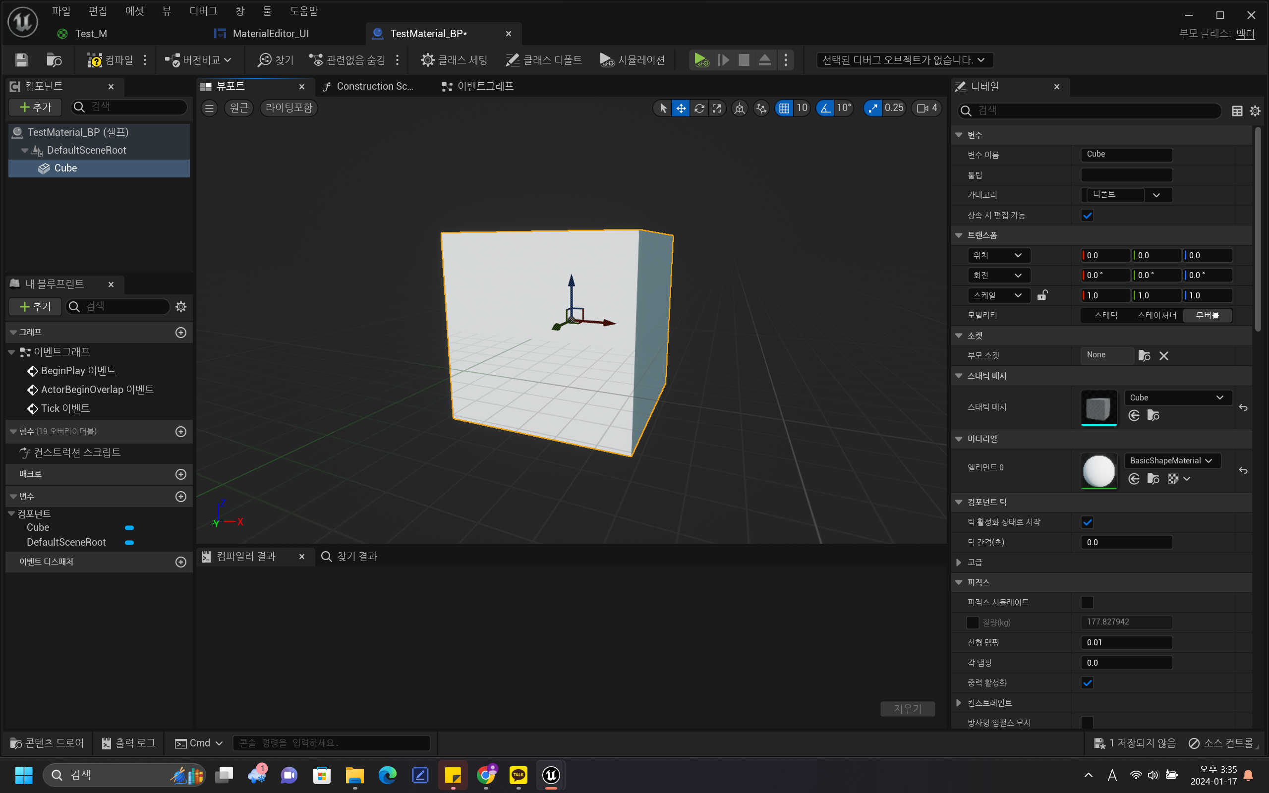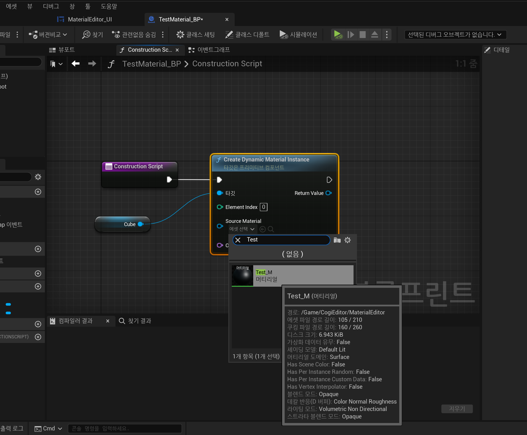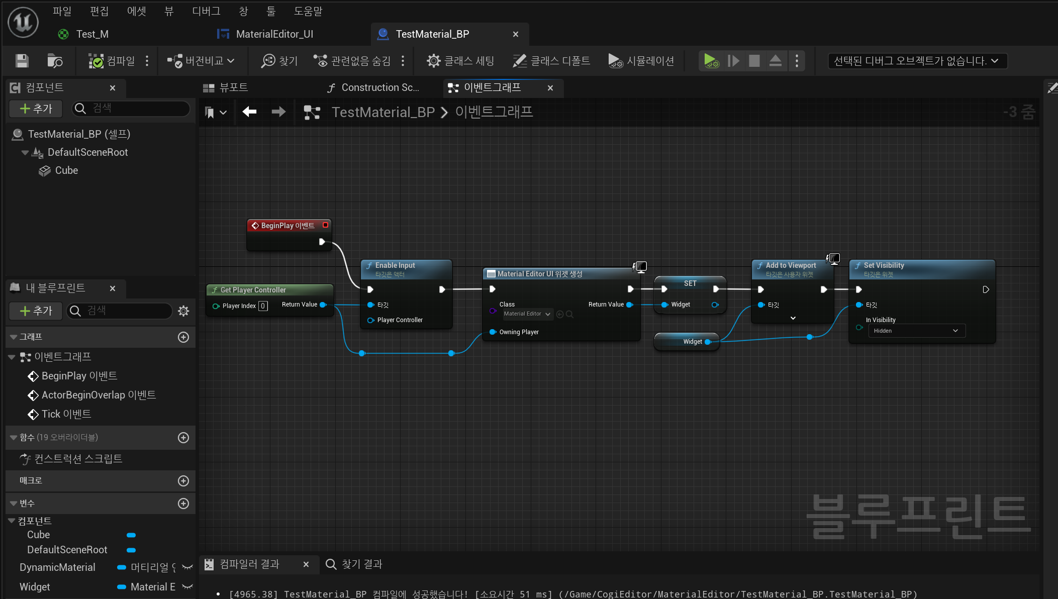 그림과 같이 블루프린트 작성 후 생성했던 메테리얼을 적용