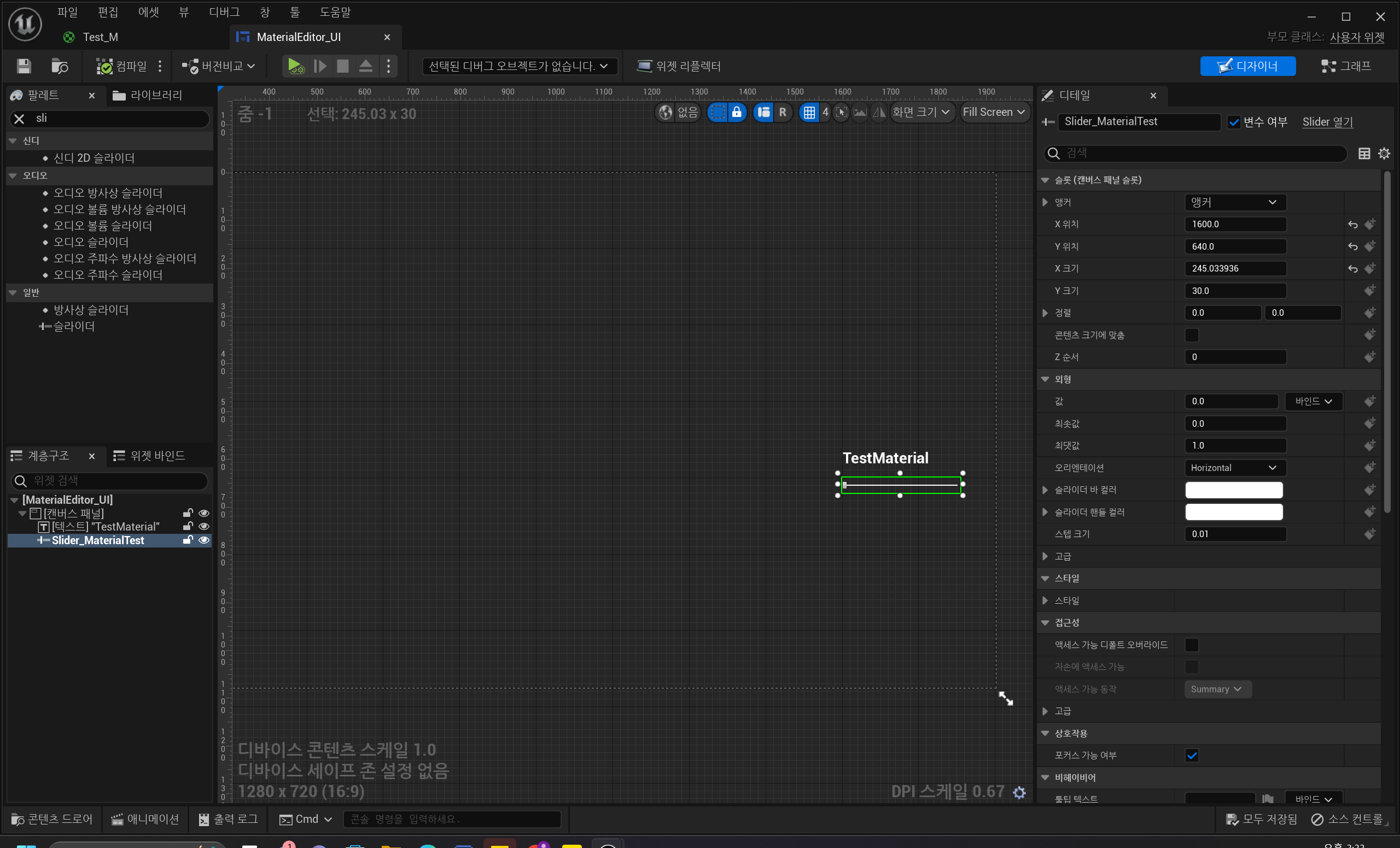 위젯 생성 > 유저 인터페이스 생성 후 그림과 같이 캔버스, 텍스트, 슬라이드 바를 생성
