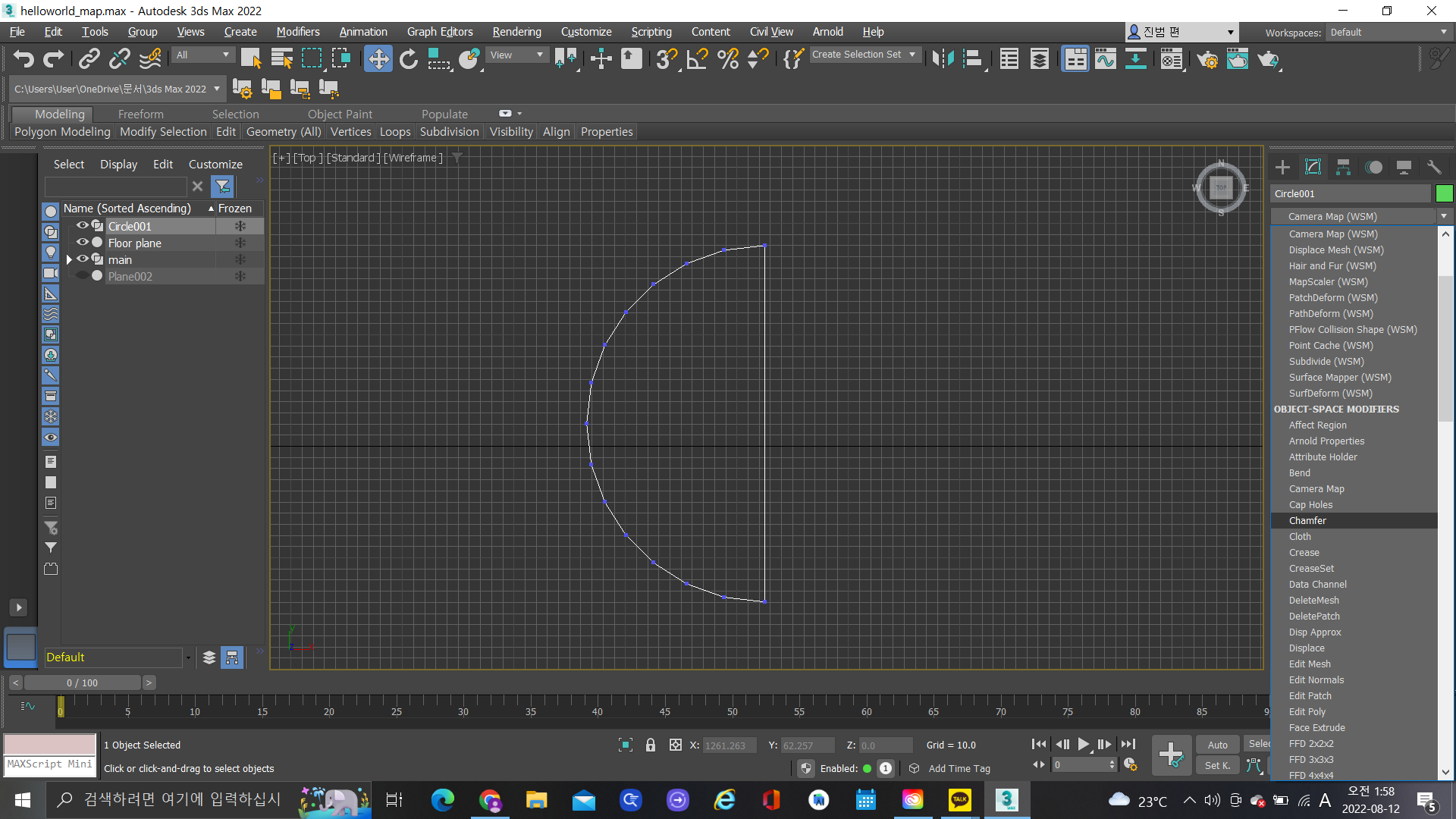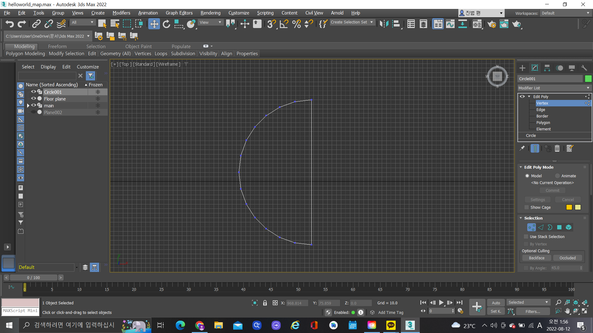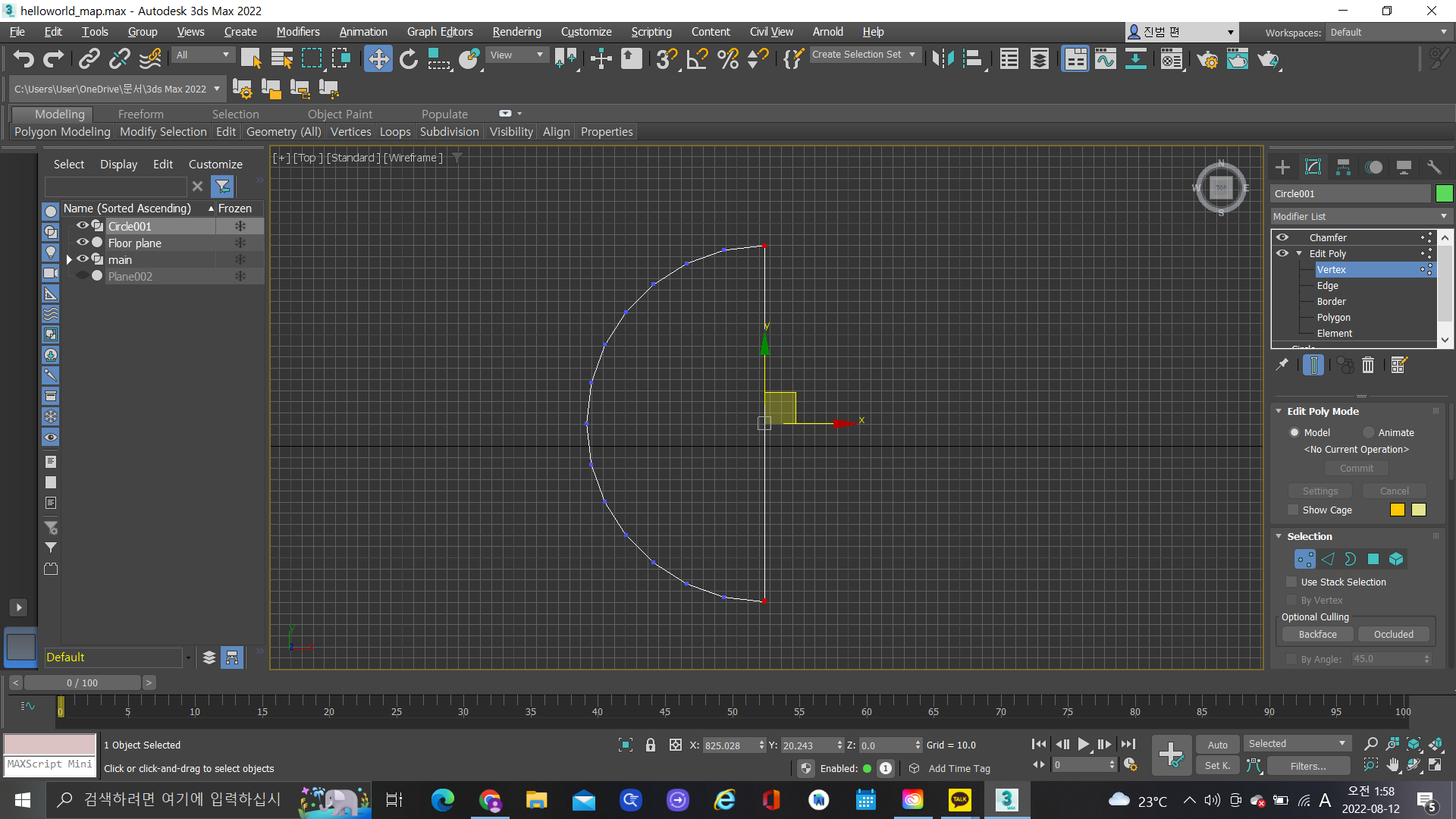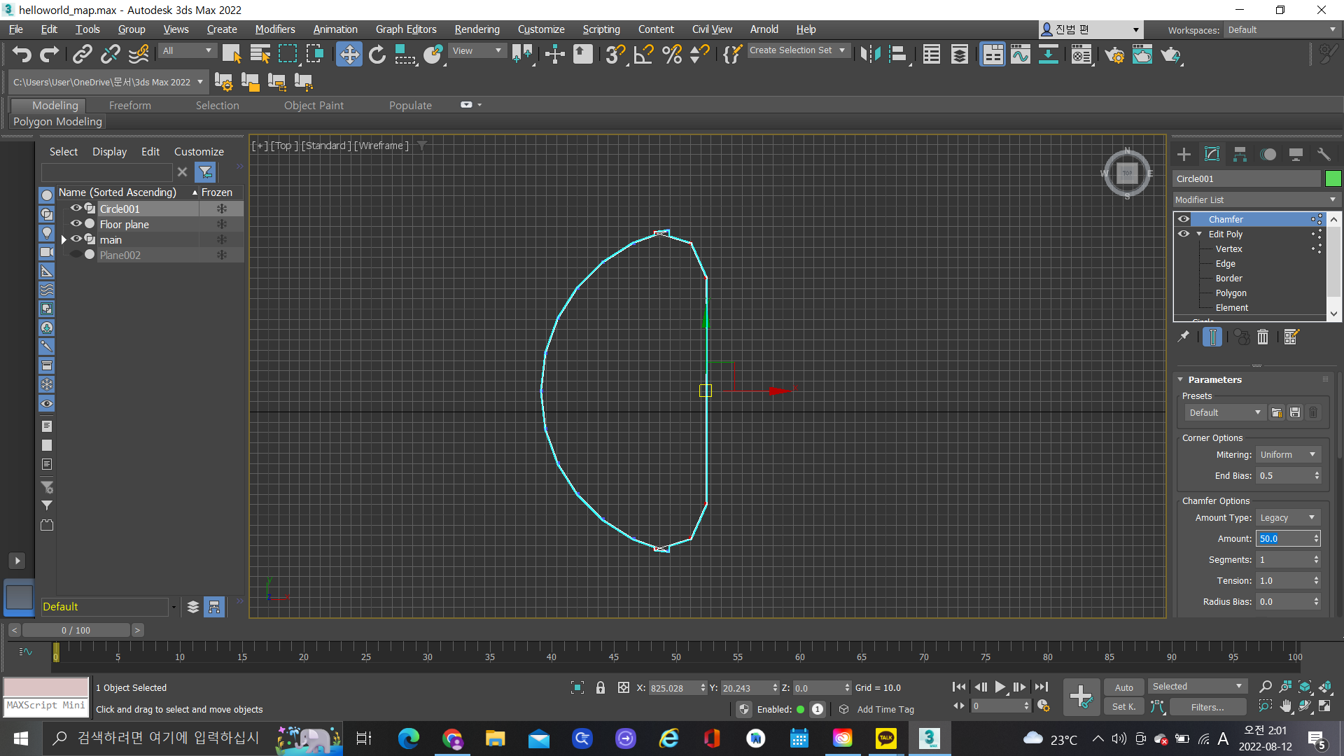 우선 반원을 에딧폴리하여 각진 물체를 만들어보았습니다