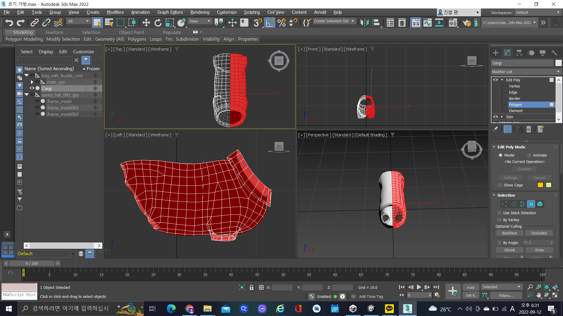 오브젝트 선택 -> 우측 모디파이에서 에딧 폴리 -> 폴리곤을 선택하여 나눌 부위를 마킹합니다