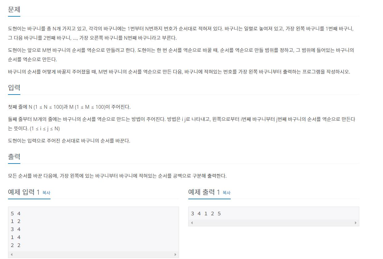 이 문제는 N개의 바구니가 일렬로 놓여 있을 때, M번의 연산을 통해 바구니의 순서를 바꾸는 문제입니다. 각 연산은 L번 바구니부터 R번 바구니까지의 바구니 순서를 뒤집습니다. 예를 들어, 1 2 3 4 5 순서로 놓인 바구니에서 2 4 구간을 뒤집으면 1 4 3 2 5가 됩니다.