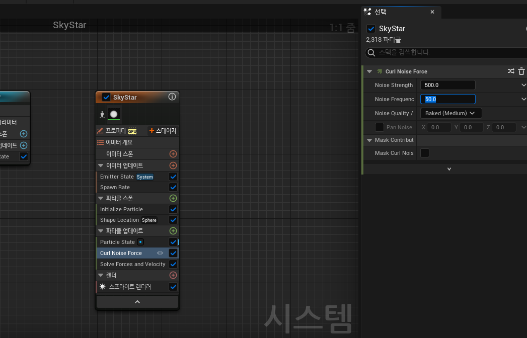 파티클 업데이트 > 퀄 노이즈 포스 선택 > 픽스 클릭